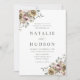 Elegante Winter-Blumeneinladungen mit Ihren Hochzeitsdetails in dunkelgrüner Schrift mit Blumenbouquets an den Ecken. Die Blume sind in einer Farbpalette mit staubiger Rose, hellrosa, Elfenbein und sanft goldgelber Farbe gehalten, mit Eukalyptus-Blätter und Winterfolien in den Farbtönen von Salbeigrün und üppigem Waldgrün.
