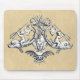 Nautisches Emblem aus einer Vintagen Weltkarte mit einem Paar Kirschen, die auf dem Rücken von Delphinen im Ozean reiten und einen Dreier tragen. Gargoyle und Flügel in der Mitte vervollständigen das Symbol des Meeres.