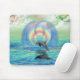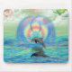 2 Delphine, die im Ozean nahe einem schönen Steigen von Farben und von Wasser mit 2 Planeten, einem Mond und einer bunten Sonne schwimmen. Rosa, Blaue, Aqua-, Gelbe und Grünefarben im Wasser und im Himmel.