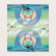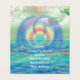 2 Delphine, die im Ozean nahe einem schönen Steigen von Farben und von Wasser mit 2 Planeten, einem Mond und einer bunten Sonne schwimmen. Rosa, Blaue, Aqua-, Gelbe und Grünefarben im Wasser und im Himmel.