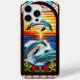 Farbenfrohe Glaskunst, die Delfine anmutet, die sich anmutig gegen einen malerischen Sonnenuntergang über dem Wasser sprengen, umgeben von faszinierenden Blumenmustern in lebhaften Tönen, die Natur, Leben und künstlerische Schönheit symbolisieren.