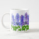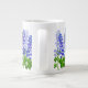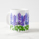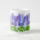 Originelles Kunstdesign der blauen und lila Delphinium oder Larkspur Blume von Carolyn McFann von Two Purring Cats Studio auf einer qualitativ hochwertigen Tasse für Blumenfans.