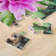 Un puzzle parfait pour les amoureux de la nature. Cette photo de MiaMoon Photography a été transformée en puzzle. Il est d'une botte de cowboy métallique et d'une fleur rose sur un lit de rochers avec verdure.