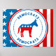 Une silhouette stylisée d'âne, remplie de couleurs bleu et rouge. La partie supérieure est bleue avec des étoiles blanches, tandis que la partie inférieure est rouge. Le dessin général de l'âne représente un symbole politique.