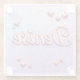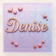 This glass coaster features a lavender gradient background with a pink border. The name Denise is showcased in pink script with pink hearts and daisies. The letters in Denise are pink with a gold outline. The coaster is a square glass coaster. The glass coaster is dishwasher safe.