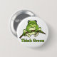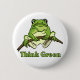 Denke ökologischknopf, wenn ein niedlicher Frosch an einer Niederlassung hängt. Eine große Erinnerung für uns zum denke ökologisch, recyceln, konservieren u. schützen unseren Planeten! Vervollkommnen Sie für Tag der Erde oder jederzeit!