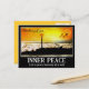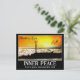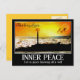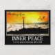 Ein Bild einer Person, die am Ende einiger Felsen unter einem schönen Sonnenuntergang sitzt, mit Möwen, die an einem Vollmond vorbeifliegen. Redewendungen auf der Postkarte "INNER PEACE" gedruckt, sitze ich in Frieden zu wissen, alles ist gut.