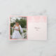 Dentelle blanche élégante avec perles carte de remerciement de photo de mariage rose présentant de la dentelle blanche avec des perles beige/écru sur un fond rose doux qui recouvre deux coins d'un rectangle blanc avec une bordure rose. Votre photo est à l'intérieur gauche. Texte marron. Notez que la dentelle est « imprimée » et non du vrai tissu. Ce design élégant, shabby chic sophistiqué et romantique fait partie d'une collection de mariage et est parfait pour un mariage chic de printemps, d'été ou d'automne.