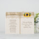 Dentelle blanche élégante avec ruban et tournesol sur le programme de mariage plié burlap. Il présente de la dentelle blanche sur un burlap naturel beige avec deux rubans de satin croisés et des tournesols. Texte en marron. Notez que dentelle, burlap et tournesols sont tous "imprimés" et non de vrais tissus ou fleurs. Vous devrez plier dans le centre pour avoir un programme plié. Choisissez seulement le type de papier de valeur comme il se plie bien.