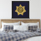 Département des services correctionnels, AGENT CORRECTIONNEL Canvas Print est un dessin d'art graphique. Le badge est créé en or et noir avec une petite touche de bleu. Une étoile dorée de sept (7) points forme le badge. Le texte qui courbe le haut de l'insigne dit : MINISTÈRE DES CORRECTIONS. Texte en bas : AGENT CORRECTIONNEL. Ces mots s'assoient sur une solide bague noire. Davantage d'or orne l'insigne partout. Au centre se trouve un emblème d'aigle aux étoiles dorées. Le texte plus petit au centre dit : Sceau de l'Etat. Le badge n'est pas spécifique à l'état. Sous le badge d'or est un arrière - plan bleu solide. Une jante extérieure noire avec des bords dorés.