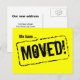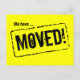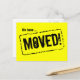 Déplacer des cartes postales avec attention obtenir des couleurs. Design jaune et noir clair avec estampille en caoutchouc. Texte mobile personnalisé ; Nous avons déménagé ! Ajoutez votre nouvelle adresse à l'arrière. Cartes de déménagement modernes pour la maison et les affaires.