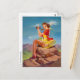 Klassische PinUp-Karte mit einem PinUp Girl, das auf einem Felsen sitzt und die Natur mit Ferngläsern erforscht, gemalt von Art Frahm (1907-1981)