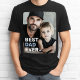 T - Shirt mit dem eigenen Foto und dem Text "Bester Papa je" als weißes und hellblaues Overlay in der unteren links Ecke.