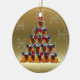 Tasse Bier werden in einer Pyramide gestapelt, die mit Kugeln, Lampen und einem schönen roten Stern auf der Oberseite dekoriert ist. Die Basis besteht aus Kartoffelchips und Erdnüssen in der Muschel. Es ist Zeit für das Party.