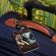 Ein majestätischer, Bengalischer Tiger, gerahmt von einer geschnitzten Holzgrenze, bewundert die Landschaft jenseits von Bergen, üppigen Wäldern und einem Fluss, der durch das Tal fließt.