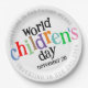 Feiern Sie den Weltkindertag mit diesen Tellern aus dem Gedenken an den "Weltkindertag", die in einem farbenprächtigen Farbspektrum spielerisch verzerrter Briefe gefeiert werden, umgeben von eingewickeltem Text (die Botschaft für 2024) oben und unten. Kopieren und Layout © W.H. Sim. Alle Rechte vorbehalten. Weitere Informationen unter zazzle.com/expressionsoccasions