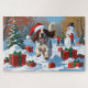 Ein anmutiger englischer Setter läuft fröhlich durch die schneebedeckte Winterszene und trägt einen festlichen roten Weihnachtshut. Dieses elegante Design hebt das gepolsterte Mantel der Rasse, die sanfte Persönlichkeit und den lebendigen Geist hervor und erweckt gleichzeitig die Wärme und den Zauber der Urlaubssaison. Ein herzlicher Winterurlaub voller festlichen Charme.