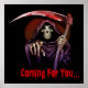 Dieses Design besticht durch den düsteren Sensenmann mit den tröpfchenroten Worten "für dich kommen...". Fantastisch zu Halloween.