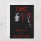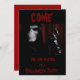 Ein maskierter Schädel getragen mit einem schwarzen Kapuzenumhang und einer schwarzen handgemachten Hand, die Sie zum Kommen einlädt. Ein Maronvorhang dient als Kulisse dieses Fotos. Eine großartige Einladung. Passen Sie sich mit Ihren eigenen Informationen an.