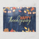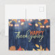 Diese individuell gestaltbare Erntedank-Postkarte ist der ideale Weg, Ihren Lieben herzliche Wünsche zu senden. Die Einrichtung aus blauem Holz ist mit orangefarbenen und gelben Blätter geschmückt, was ein gemütliches und einladendes Ambiente schafft. Der gelbe, kursive Schriftart fügt der Botschaft "Glückliches Erntedankfest" eine elegante Touch hinzu, während die Saitenleuchten oben eine festliche Touch hinzufügen. Diese Postkarte bringt jedem ein Lächeln ins Gesicht und lässt sie sich in dieser Urlaubssaison schätzen. 🍁 🦃