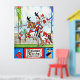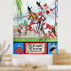 Ein buntes Vintages mittelalterliches Plakat mit einem Ritter in voller Rüstung, der auf einem Pferd reitet und einen Lanze hält.