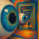 "Der Korridor des Sehens" - ein surreales Portrait. Ein riesiger, spiegelnder Korridor erstreckt sich bis in die Ewigkeit, wobei jedes Segment ein enormes wachsames Auge hat. In seiner Mitte steht ein Mann bewegungslos, ohne sein eigenes Spiegelbild zu sehen, verloren im unendlichen Blick. Das stilisierte Gemälde verbindet Wärme und Kälte, Distanz und Intimität, in einer Meditation über Wahrnehmung, Zeit und die stille Konfrontation zwischen Selbst und Unendlichkeit.