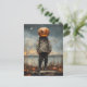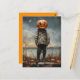 Das Bild zeigt eine Figur, die im Freien stehend ist und ein abgenutztes, robustes Militär-Outfit mit Stiefeln trägt. Statt eines Kopfes hat die Figur einen großen, geschnitzten Kürbis mit einem bedrohlichen, leuchtenden Jack-o'-Laterne-Gesicht. Der Himmel ist bedeckt, was der Szene eine unheimliche Atmosphäre verleiht, und der Boden ist mit trockener Vegetation und zwei kleinen Kürbissen verstreut, die das Halloween-Thema unterstreichen. Der Malstil erinnert an den klassischen amerikanischen Stil, der ein Gefühl von Nostalgie und Unbehagen weckt.