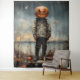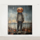 Das Bild zeigt eine Figur, die im Freien stehend ist und ein abgenutztes, robustes Militär-Outfit mit Stiefeln trägt. Statt eines Kopfes hat die Figur einen großen, geschnitzten Kürbis mit einem bedrohlichen, leuchtenden Jack-o'-Laterne-Gesicht. Der Himmel ist bedeckt, was der Szene eine unheimliche Atmosphäre verleiht, und der Boden ist mit trockener Vegetation und zwei kleinen Kürbissen verstreut, die das Halloween-Thema unterstreichen. Der Malstil erinnert an den klassischen amerikanischen Stil, der ein Gefühl von Nostalgie und Unbehagen weckt.