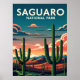 Eine stilisierte Abbildung eines wüstenartigen Sonnenuntergangs über dem Saguaro-Nationalpark mit prominenten Saguaro-Kakteen und dramatischen Wolken.