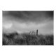 Schwarz-Weiß-Foto am Ende des Zauns mit einem Single-Post rechts vom Foto mit einem dunkleren, wolkigen Himmel und Dünen im Vordergrund, Brancaster, Norfolk, England