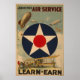 Ein Poster des Ersten Weltkriegs mit den Insignien des Flugdienstes, verschiedenen Flugzeugen, darunter Flugzeuge und Flugsteige, und einer Crew, die zu einem Flugzeug im Vordergrund tendiert.