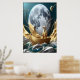 Ein Mann in einem Boot fischen unter einem massiven, glühenden Mond. Die Szene ist surreal, das Schiff und die umliegende Landschaft scheinen aus Gold zu sein. Delphine schwimmen in den Wellen unten.