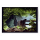 Eine landschaftliche Ansicht entlang einen hölzernen Weg, mit dem Morgennebel noch in der Wiese auf dem Recht. Eine alte Dame, die leisurely gehen vor dem hektischen Tag spricht. Wiedergabe einer ursprünglichen Aquarellmalerei.