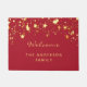 Eine schicke, rote Hintergrundfarbe mit tropfenden Imitaten goldenen Sternen. Mit dem Text: Willkommen. Personalisieren Sie Ihren Familiennamen und fügen Sie ihn hinzu. Goldene Buchstaben. Glamourös und modern für Ihre Zuhause.