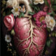 Eine reich strukturierte Kollage anatomischer Herzen verflochten mit schattigen Blütenblättern, weichen Blütenblättern und schleichenden Venen. Tief rosa Farbtöne bluten in Schwarz und rufen Leidenschaft, Sehnsucht und die bittersüße Schönheit des Zerfalls hervor. Feine Details sorgen für eine Vintage gotische Eleganz.