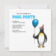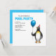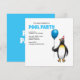 Der Party-fähige Pinguin hält einen blauen Luftballon mit seiner rechten Hütte und einen Party-Hut auf seinem Kopf.