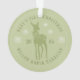 Moderne, staubige, grüne Säuglingsschmuck für die erste Weihnachtsfeier des Babys personalisieren mit dem Namen des Babys, dem Hirsch mit Bogen, Schneeflocken und Kurven-Schriften in Serif-Schriftart.