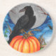 Originelle Malerei von Sandra Gale für die Halloween-Saison mit einem schwarzen Raben auf einem Kürbis. Das schöne Design für Kinder und Erwachsene, um den schönen Halloween-Urlaub zu feiern.