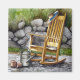 Ein Schaukelstuhl aus Kiefernholz mit einem Strohdach, der mit einer farbenfrohen blauen Bandana an der Rückenlehne dekoriert ist. Auf dem Boden auf den Kopfsteinen eine rostige Gießkanne und einige Terrakottapflanzer. Im Hintergrund ist eine Wand aus natürlichen Felsen und viel Grün. Eine friedliche, landschaftliche Wasserfarbe.