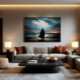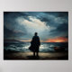 Vor einer unruhigen See und einem dramatischen Himmel blickt eine einsame Figur ins Unbekannte. Der Zwielichtschimmer deutet Hoffnung an, während das Boot am Ufer zu einer Reise einlädt.