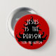 Jésus est la raison pour laquelle l'épingle de Noël. Noir et blanc sur un arrière - plan rouge, cette épingle ronde a un texte funky et le contour d'un arbre bouclé dans l'arrière - plan. Parfait pour les ados ou les groupes de jeunes.