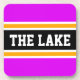 Dieses sportliche, farbenfrohe Design zeichnet sich durch athletischen THE LAKE Text in einem markierten breiten schwarzen Streifen mit weißen und gelben pinstripes gegen leuchtend rosa äußere Streifen aus. Der Text und die Farben in diesem Design können personalisiert sein.