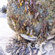 Ein fotografisches Design der Meerestide, die sich bis zum Strand und zu den Felsen wäscht und Algen und Barnacles aufdeckt.