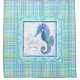 Der Hintergrund ist ein handgemalter Wasserstil, kariert mit Spritzern und Blasen, die in Aquarelle, Blau, Lavendel und Grün bemalt sind, um eine frische Farbpalette am Strand zu erhalten. Sie können die karierten größer oder kleiner. Das zentrale Bild ist ein Gemälde eines Seepferds und der handgemalte Skripttext "der Strand ruft". Der Hintergrund ist mit blauen, glänzenden Spritzern und einem Rand von Aqua-Blau-Weiß-Scrollwork versehen. Seashore, Wohngestaltung des Küstenstrands von Audrey Jeanne Roberts, Copyright.