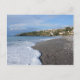 Der leere Strand im Winter in Scalea an der kalabrischen Küste. Im Sommer ist diese historische antike Stadt eines der beliebtesten Urlaubsziele für Italiener, die von ausländischen Touristen noch weitgehend unentdeckt geblieben sind. Dahinter liegen Berge und ein schnell fließender Fluss mit weißen Wasserrutschen.