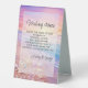 The Beach at Sunset Wunschsteine Tafelzelt Schild Dieses Bild zeigt eine ruhige Szene am Strand während des Sonnenuntergangs. Der Himmel ist mit lebhaften Farbtönen wie Rosa, lila und Orange bemalt, wie die Sets am Horizont, was einen fesselnden Verlauf erzeugt. Die sanften Wellen rollen über den Sandstrand, wo sich verschiedene Muscheln und Seesterne verstreut befinden. Muscheln und Seesterne sind in Pastellfarben gehalten, was die sanften Farbtöne des Sonnenuntergangs ergänzt. Dieser ruhige und malerische Augenblick ruft ein Gefühl der Entspannung und der Wertschätzung für die Schönheit der Natur hervor.