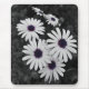 Dieses Bild zeigt eine Reihe von Gänseblüten mit weißen Blütenblättern und markanten lila-blauen Zentren. Hintergrund und Blattwerk sind in Schwarz und Weiß gehalten, wodurch ein selektiver Farbeffekt entsteht, der die lebhaften Farbtöne der Blume unterstreicht. Der Kontrast zwischen der entsalzten Umgebung und den zarten Blüten verleiht dem Bild eine künstlerische, fast surreale Qualität, die die Schönheit und Komplexität der Natur unterstreicht.