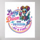 Lebhaftes, buntes Design mit einem weiblichen Skelett mit dem Haar in einem Bogen und einer Tasse Kaffee. Der farbenfrohe Text lautet: "Den Traum eine schlechte Entscheidung nach der anderen leben". Dieses Design ist auf einer Vielzahl von Produkten erhältlich.