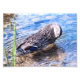 Eine Mallard Hen befindet sich in der flachen Zone eines Teiches, der ihre Federn anregt und in einer kreisförmigen Bewegung die Wellen über die Oberfläche des Teiches bewegt. Sie können die Reflektion von Wolken auf der Oberfläche des Teiches sehen. Und man kann durch das saubere, klare Wasser sehen. Copyright Kimberly J Tilley.