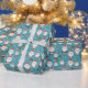 Niedliche Weihnachtsgestaltung des Weihnachtsurlaubs und Geschenke auf aqua Hintergrund mit Schneeflocken.
